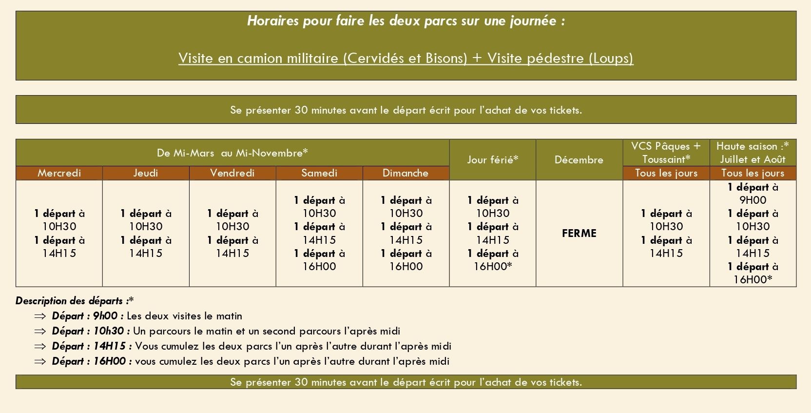 *A partir du changement d’heure (hiver) le départ de 16H00 (Pédestre) et le départ de 17H15 (en camion militaire) ne sont pas maintenus.